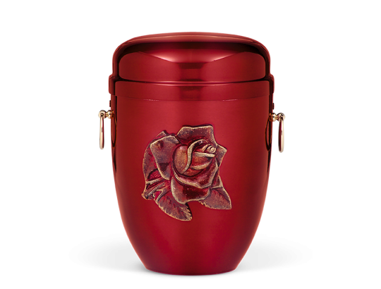 VU_5043AKUDie Kupfer-Urne besitzt eine galvanisch abgestuft gefärbte Oberfläche. Verziert wird die Urne mit einem Rosenzweig-Emblem...