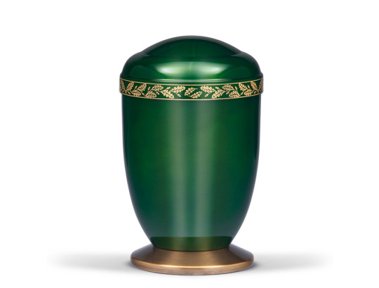 Kupferurne, Moosgrün, Dekorband Eichenlaub am Deckel, Sockel Messing